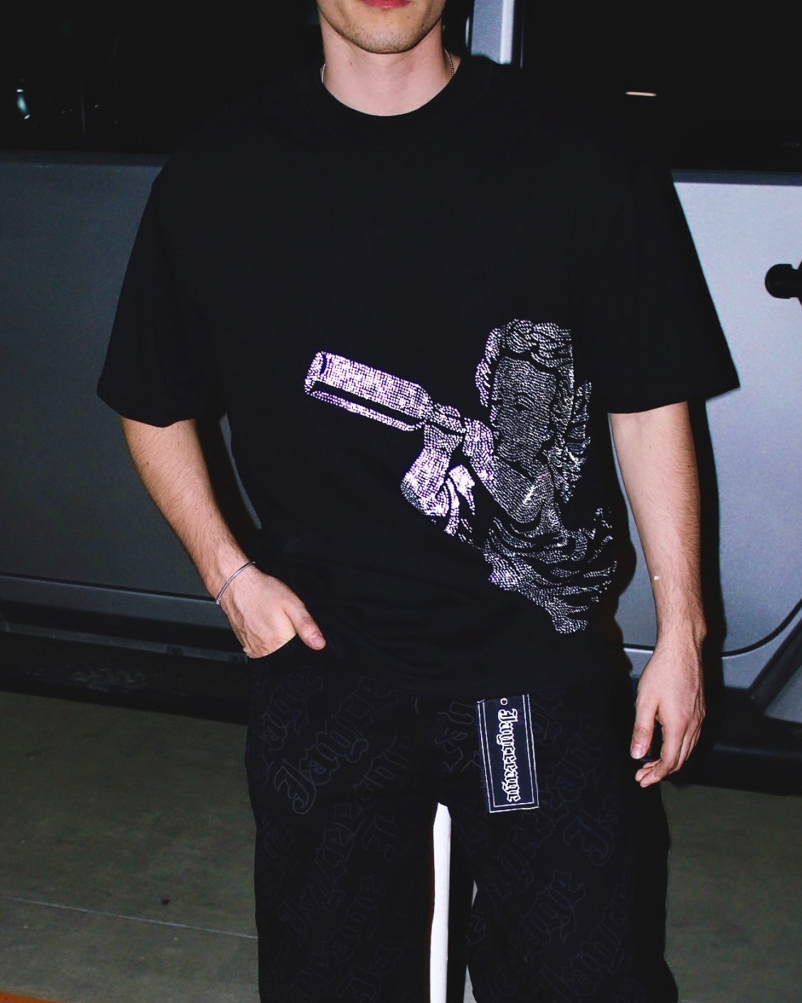 Camiseta con el clásico Drinking Angel en frente y continuación en espalda, diseño aplicado con 9000 cristales.