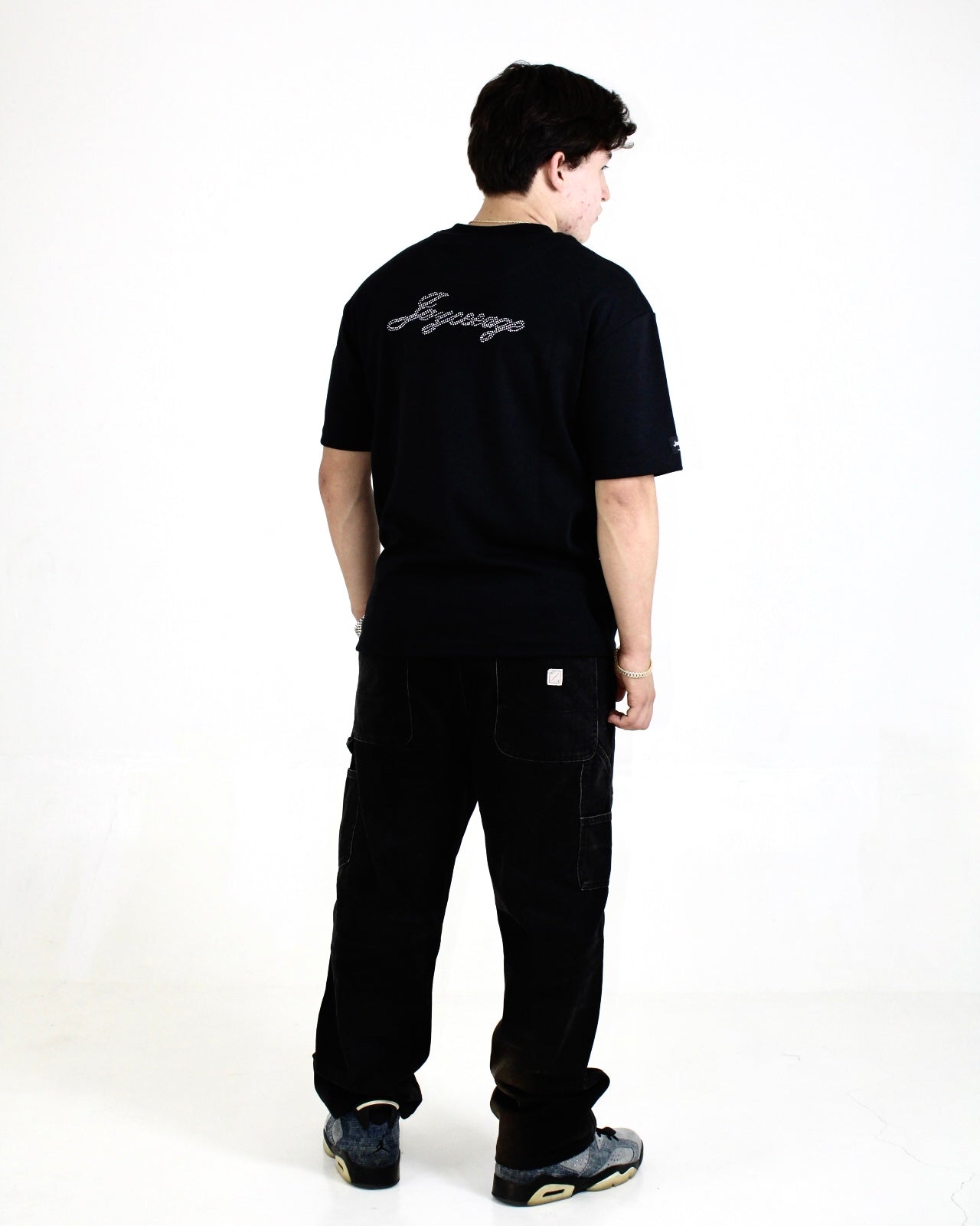 Camiseta con diseños aplicados en pedrería en frente y espalda.
