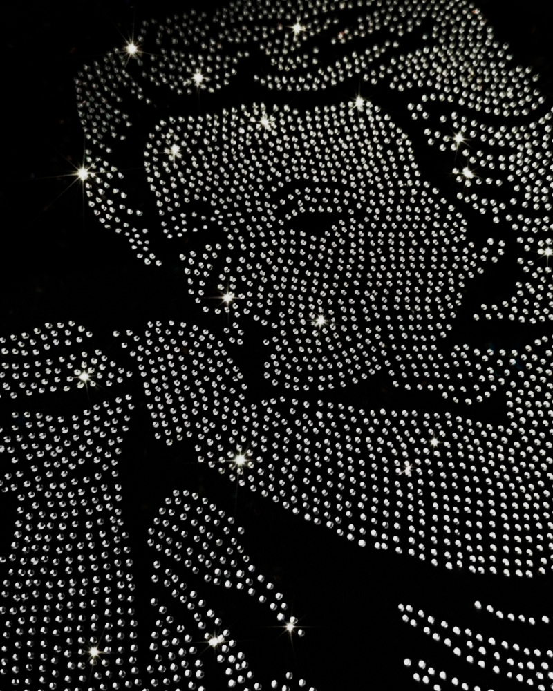 Crewneck color negro, con diseño frontal que está construido con pedrería plata premium, aplicada pieza por pieza para formar un gráfico de alto impacto visual e icónico Jayceeage que brilla con intención bajo cualquier fuente de luz.
