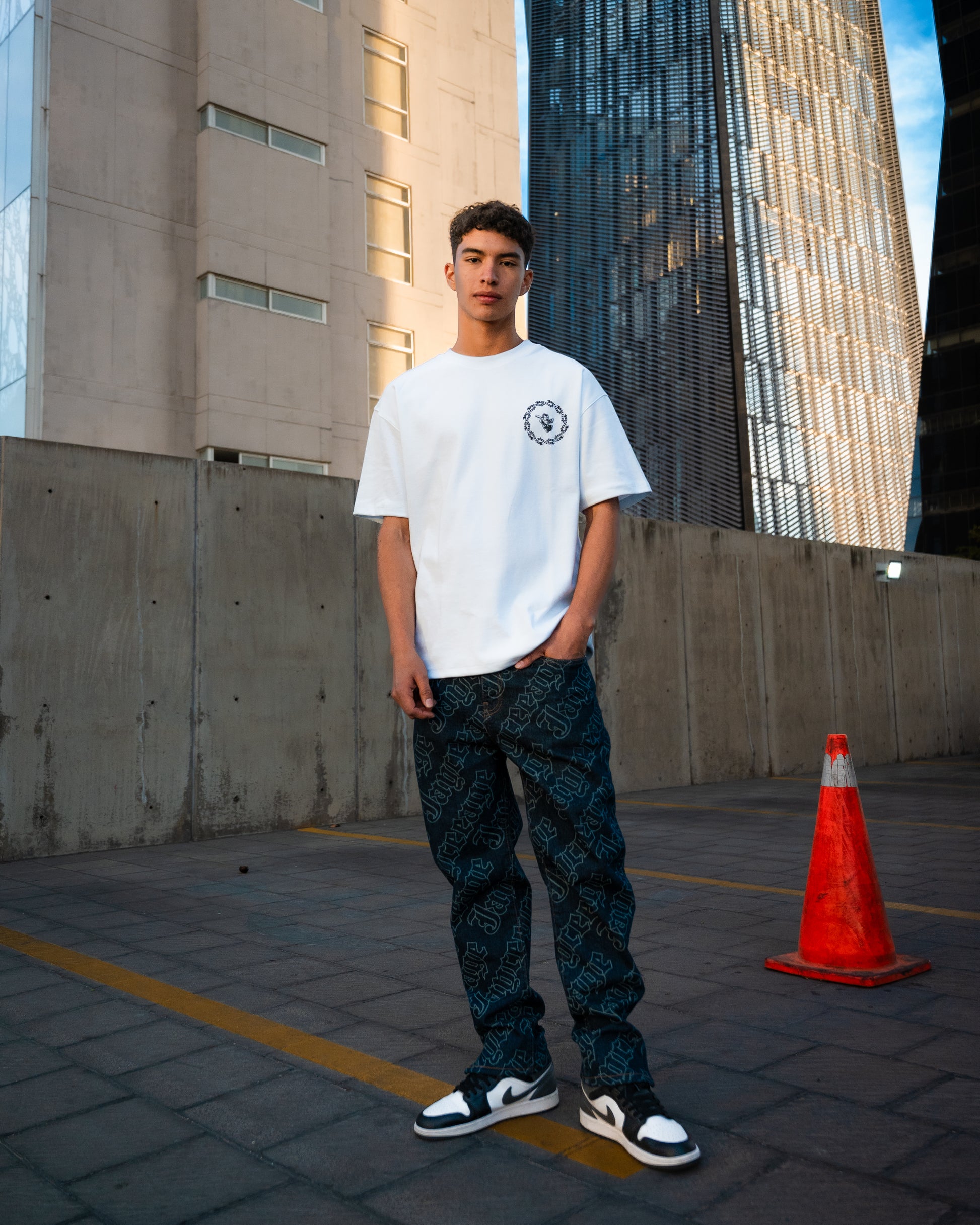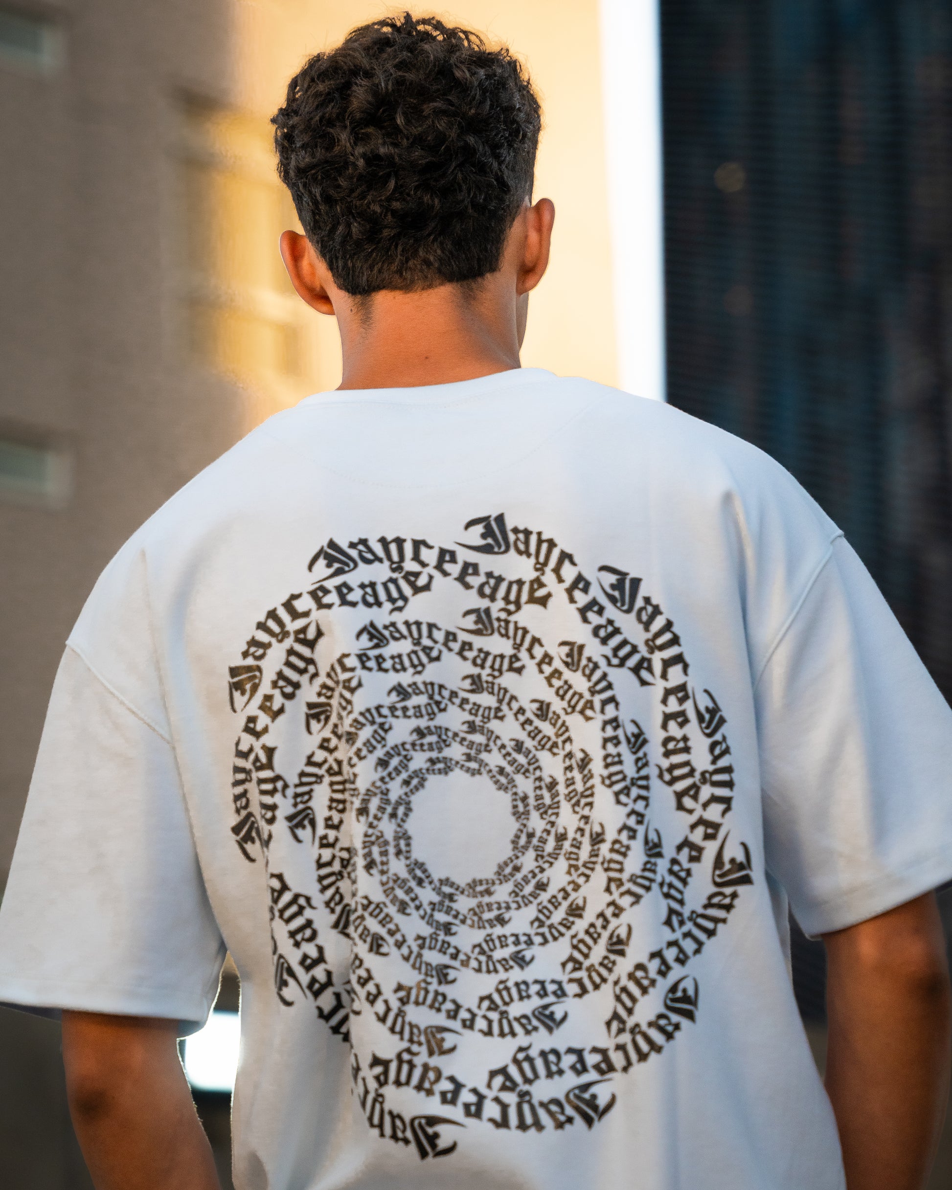 Camiseta blanca con diseño Jayceeage espinas con efecto espiral. Diseño aplicado en frente y espalda.