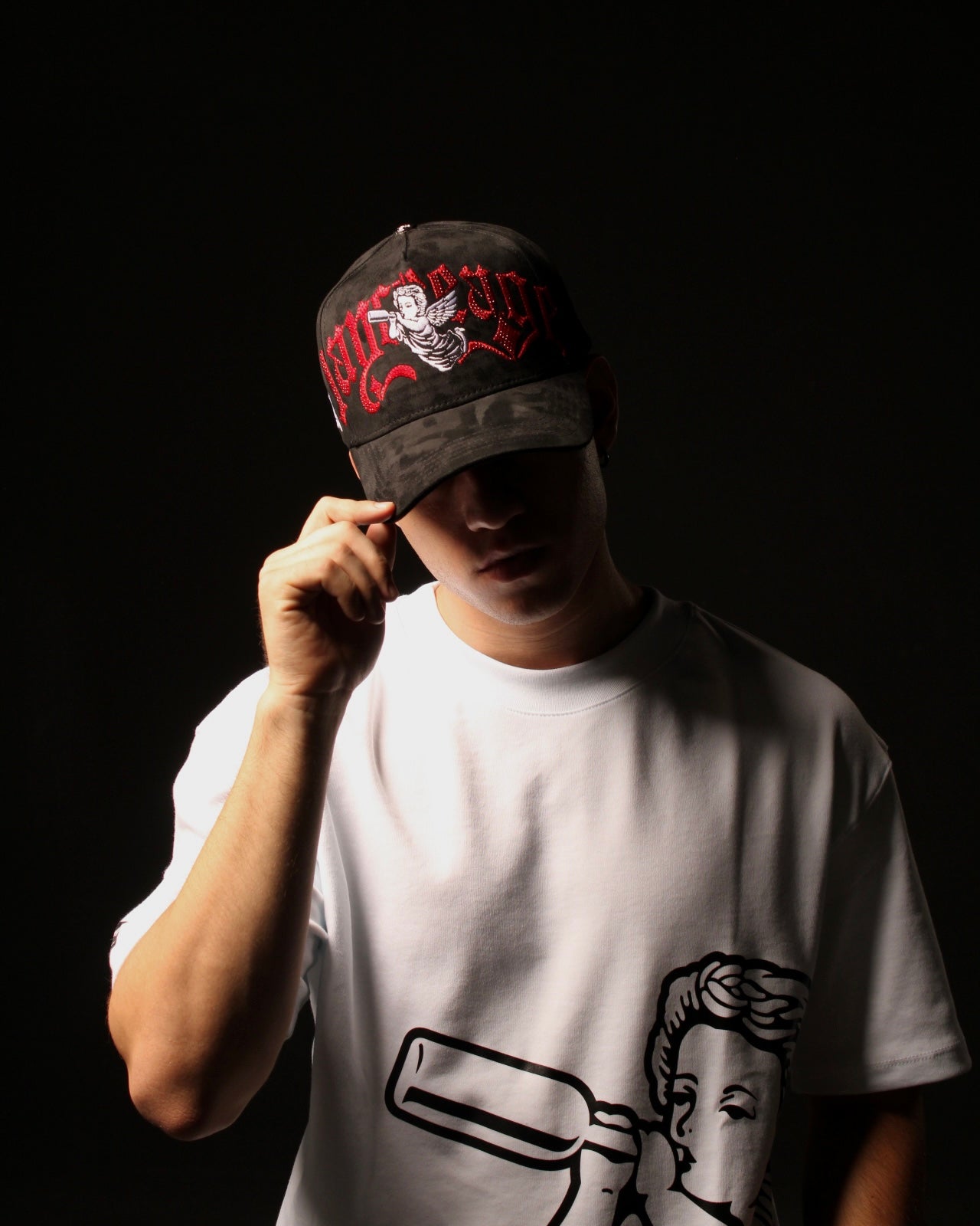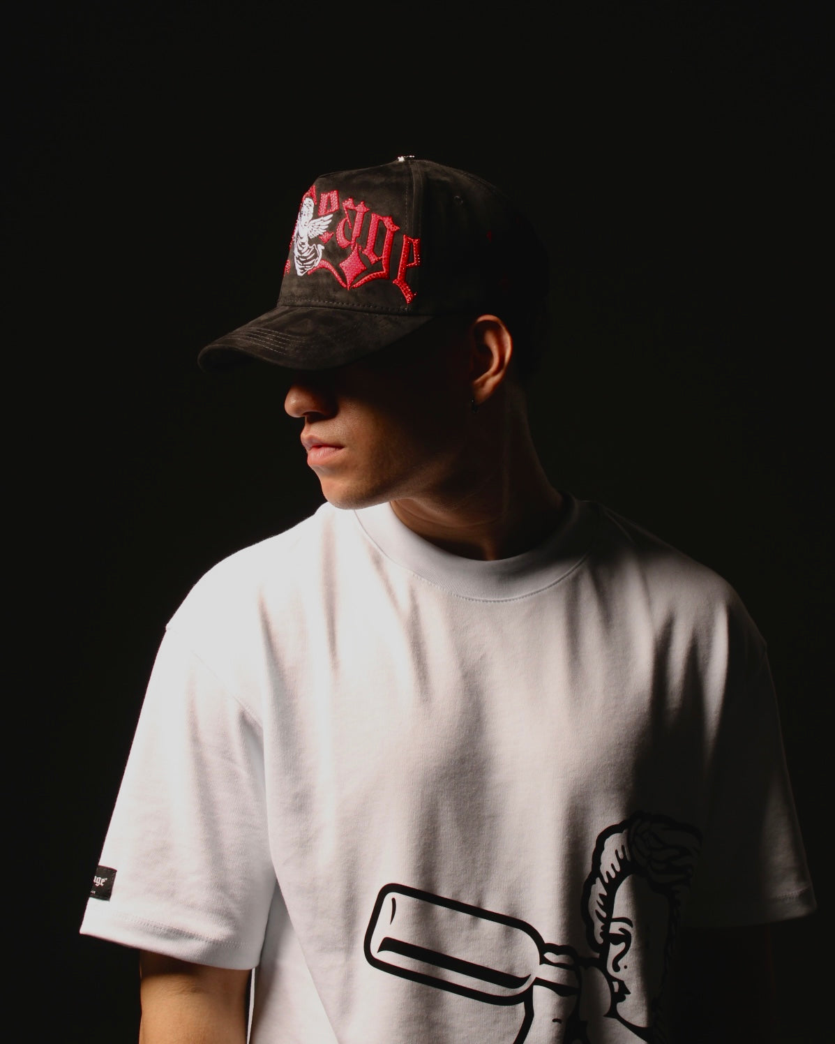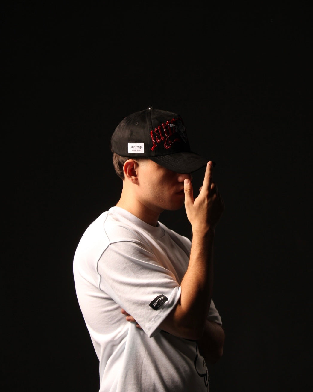Gorra ajustable con diseño bordado al frente con pedrería encima. Etiquetas micro bordadas, botón superior de metal, etiqueta metálica e interior satinado.