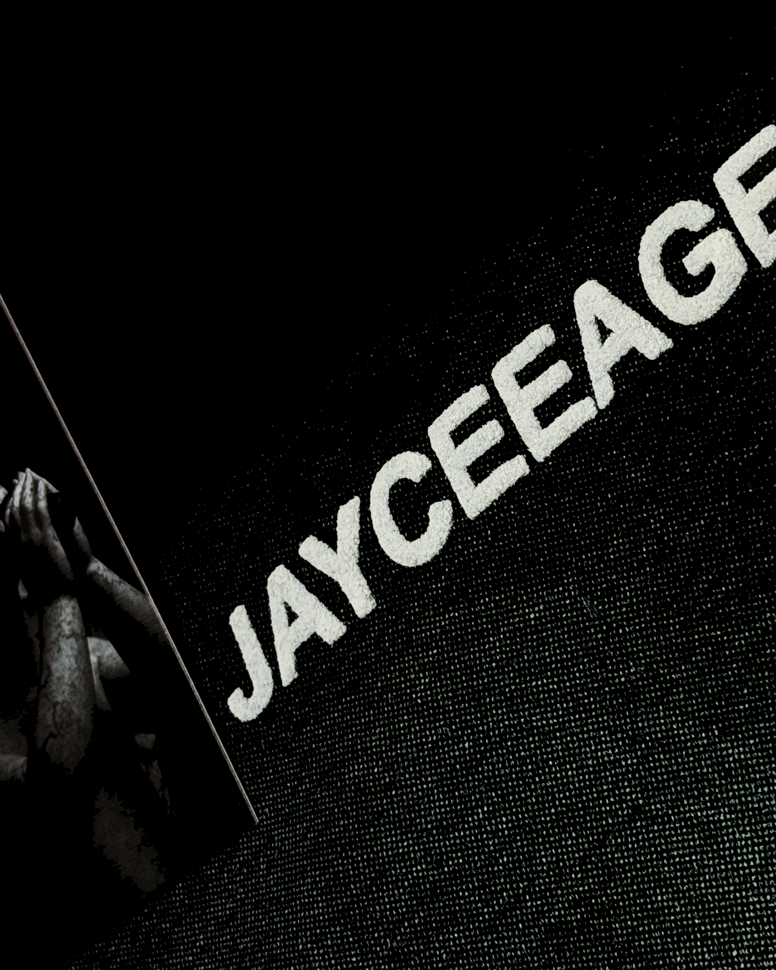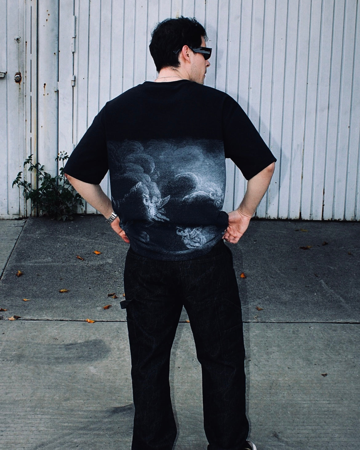 Playera negra con textura aplicada en serigrafía usando tonos blancos y grises. Integra el icónico ángel bebiendo dentro del patrón gráfico, logrando un acabado visual profundo y detallado. La parte frontal incluye tipografía Jayceeage en textura de tercio pelo, añadiendo relieve y un toque premium. Fabricada con materiales de alta calidad y un corte cómodo para uso diario.