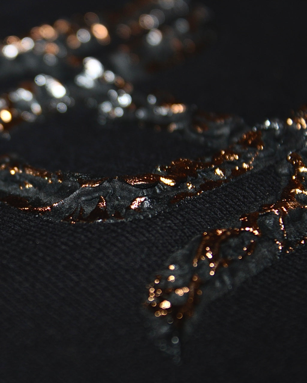 Crewneck en color negro con un diseño impreso en relieve, logrando un acabado discreto pero altamente detallado. Incorpora acentos táctiles en color plata y cobre, que añaden profundidad visual y una textura metálica perceptible al tacto. Fabricado con materiales de alta calidad y un corte cómodo, esta pieza combina minimalismo, textura y presencia premium.