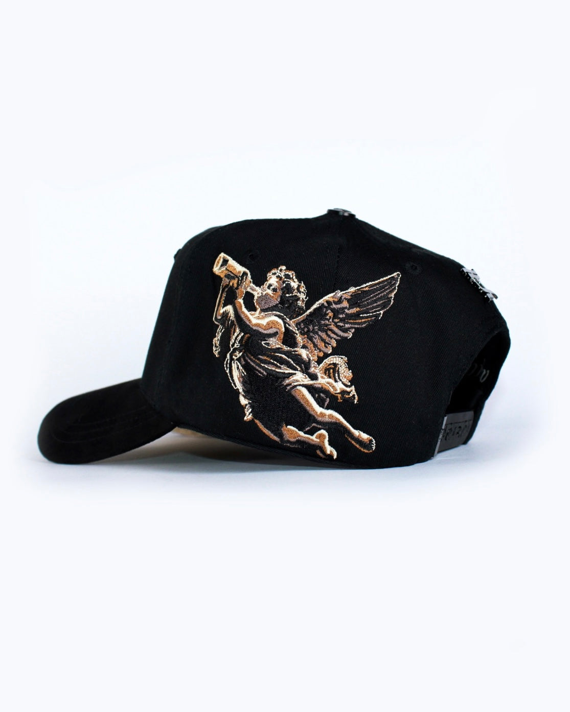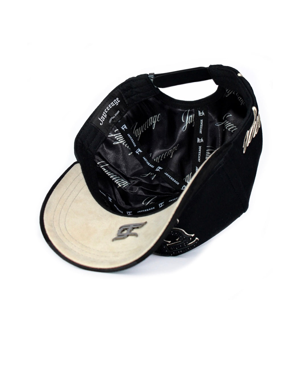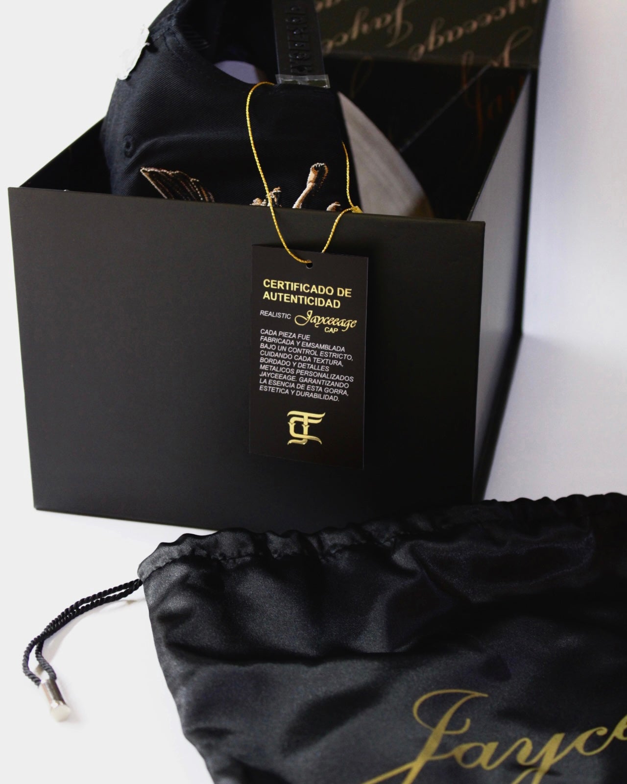La Realistic es una gorra diseñada para destacar cada detalle. Presenta bordado cursivo en el panel izquierdo y el Drinking Angel bordado en el costado derecho, simbolizando uno de los gráficos más representativos de Jayceeage. Al frente, incorpora un monograma JC en bordado 3D con aplicaciones de pedrería negra, creando un acabado poderoso y elegante.